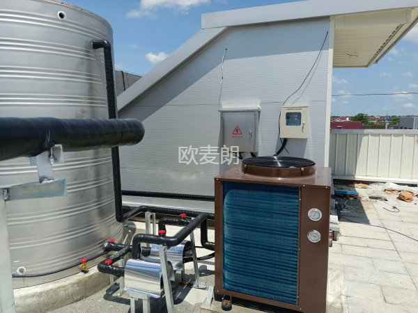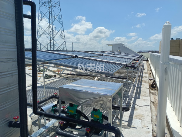 項目配置:10組太陽能集熱模塊+歐麥朗空氣能熱泵熱水機組+圓形水箱