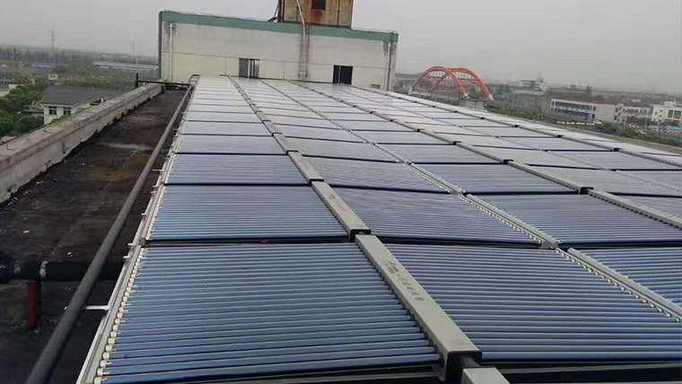 該熱水循環(huán)系統(tǒng)主要遵循工業(yè)用熱水循環(huán)的標準,使用2500多支太陽能真空管用于夏季制取生產(chǎn)用的高溫回收熱水。整個系統(tǒng)使用了多套管式太陽能集熱器、熱水循環(huán)泵、大型水箱等,安裝在廠房樓頂?shù)目盏厣稀0惭b人員通過專用工程數(shù)據(jù)和綜合實際安裝現(xiàn)實,在樓頂調(diào)整好集熱板角度,使大限度獲得太陽能源,又能滿足工廠對樓頂安裝太陽能的要求。