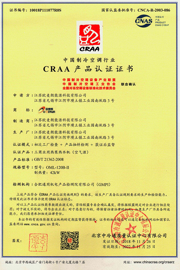 中國制冷空調(diào)行業(yè)CRAA產(chǎn)品認(rèn)證證書