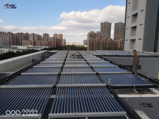 項(xiàng)目配置:100組太陽能集熱器+3臺(tái)空氣能熱泵熱水機(jī)組