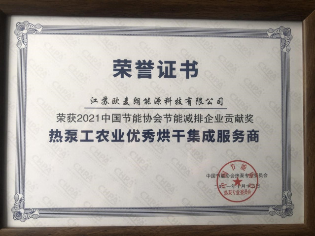 為表彰和獎(jiǎng)勵(lì)在我國(guó)熱泵應(yīng)用及研究領(lǐng)域做出突出貢獻(xiàn)的組織和個(gè)人,推動(dòng)熱泵技術(shù)進(jìn)步,促進(jìn)產(chǎn)品市場(chǎng)應(yīng)用,弘揚(yáng)節(jié)能減排國(guó)策,助推可再生能源發(fā)展,樹立行業(yè)品牌標(biāo)桿,中國(guó)節(jié)能協(xié)會(huì)熱泵專業(yè)委員會(huì)組織開展了“2021中國(guó)節(jié)能協(xié)會(huì)創(chuàng)新獎(jiǎng)熱泵行業(yè)節(jié)能減排科技進(jìn)步獎(jiǎng)和節(jié)能減排貢獻(xiàn)獎(jiǎng)”評(píng)選活動(dòng),歐麥朗憑借一流的研發(fā)水平、高效的系統(tǒng)集成能力、以及完善的售后服務(wù)體系,榮獲“熱泵工農(nóng)業(yè)優(yōu)秀烘干服務(wù)集成商”殊榮,這是對(duì)歐麥朗在烘干領(lǐng)域深耕多年成績(jī)的充分認(rèn)可和嘉獎(jiǎng),也必將激勵(lì)我們?cè)诋a(chǎn)品、技術(shù)、服務(wù)上再接再厲,永攀高峰,為國(guó)家節(jié)能減排的目標(biāo)繼續(xù)做出貢獻(xiàn)!