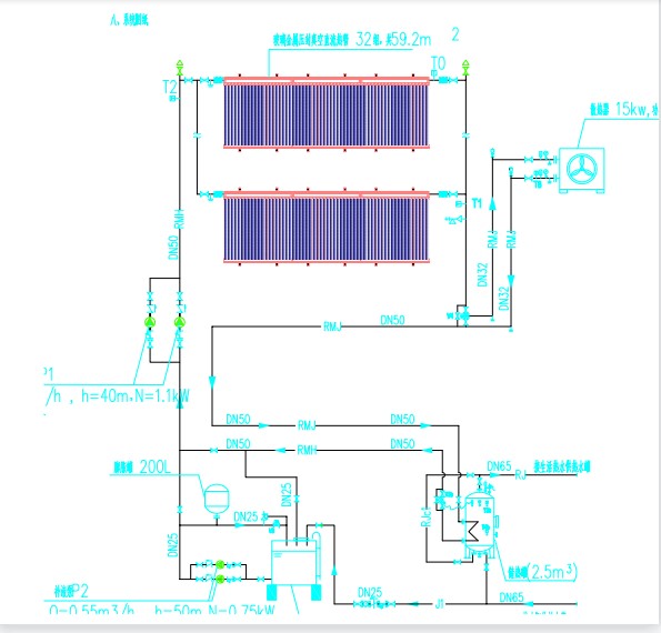 系統(tǒng)運行原理圖:(超導(dǎo)集熱器+容積式換熱器+燃氣鍋爐輔助系統(tǒng))