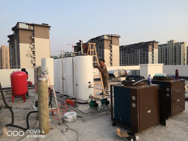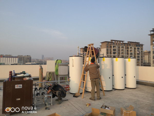 系統(tǒng)配置了5臺承壓儲熱水罐+2臺歐麥空氣能熱泵+歐麥朗自主研發(fā)的智能控制。