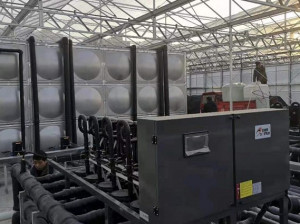 養(yǎng)殖溫棚恒溫方式是直接對溫棚環(huán)境進行恒溫來間接保證水溫的,相比于池子鋪加熱管的加熱方式系統(tǒng)更簡單,省略中間保溫水箱和一套水泵,主機加熱后的熱水直接進入末端風機盤管進行加熱,減少了保溫水箱側的熱量散失;再者末端的溫度控制也相對簡單、準確。