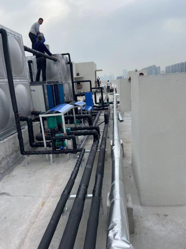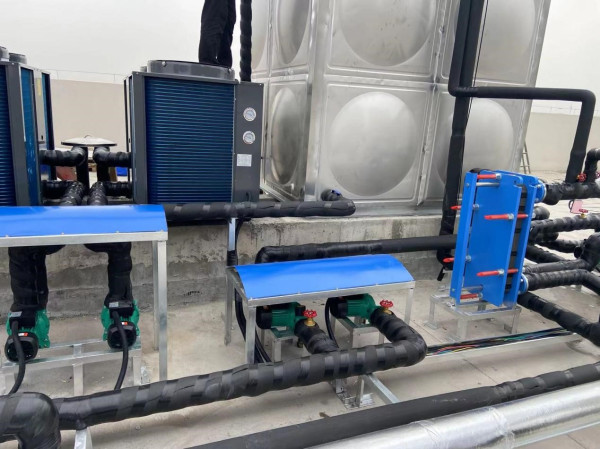 項目配置:8噸集熱水箱和8噸恒溫水箱,81組平板集熱太陽能+2臺10P空氣能熱泵