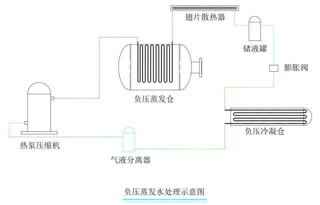 負(fù)壓蒸發(fā)首先將負(fù)壓倉內(nèi)的廢水加熱至40度左右,開啟真空泵將真空倉內(nèi)的壓力降至-90Kpa左右,廢水沸騰后水蒸氣進入殼管換熱器進行冷凝,變成冷凝水。當(dāng)熱量溢出時,四通閥自動切換,改為蒸發(fā)器散熱,以保證機組的正常工作。真空倉的廢水在水蒸氣蒸發(fā)后結(jié)晶成固廢,盡可能的減少廢水對環(huán)境的破壞。固廢可以用于焚燒發(fā)電或者掩埋處理。