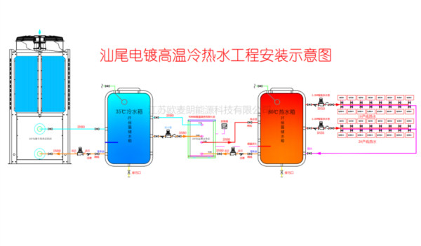 此次定制的50匹高溫水源熱泵機(jī)組是為廣東汕尾電鍍廠加熱恒溫系統(tǒng)配套使用,客戶要求加熱溫度80度,歐麥朗工程師設(shè)計(jì)采用分體式復(fù)疊(雙級(jí)耦合)高溫?zé)岜眉訜嵯到y(tǒng)。第壹級(jí)配置一臺(tái)50匹空氣源熱泵機(jī)和一只2噸的保溫低溫水箱,將水箱溫度維持在35-40度。第二級(jí)配置定制的50匹高溫水源熱泵機(jī)組和一只2噸的保溫高溫水箱,將水箱溫度維持在80-85度。空氣源熱泵加熱的低溫水箱作為高溫水源熱泵的熱源,加熱2噸高溫水箱。達(dá)到蕞大化的節(jié)能效果。