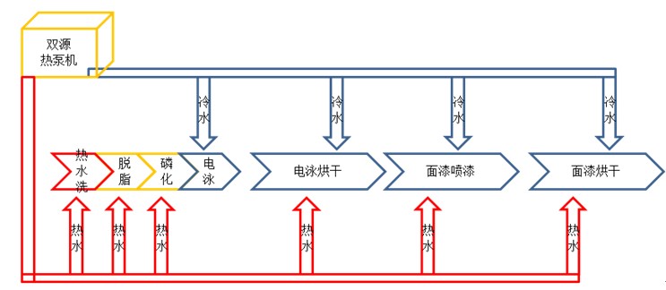 汽車生產(chǎn)制造過(guò)程包含沖壓、焊接、涂裝和總裝四個(gè)工藝過(guò)程,其中涂裝之前,先要進(jìn)行表面處理,主要目的是清除車身表面的油污、塵土、銹蝕等。完整的表面處理工藝是:預(yù)脫脂→脫脂→熱水洗→冷水洗→酸洗→冷水洗→磷化→冷水洗→表面調(diào)整→電泳→冷水洗→熱水洗→純水洗→干燥。至今工序中常規(guī)加熱、冷卻能源幾乎都是燃?xì)庵苯蛹訜嵴羝ǜ邏簾崴厮┖屠鋬鰴C(jī)冷水。各需求之間獨(dú)立處理,沒(méi)有做能源回收再利用的整合處理,造成能源浪費(fèi),單產(chǎn)能耗高等問(wèn)題。