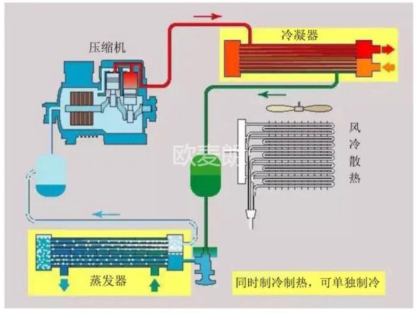 近年來,歐麥朗也緊跟時(shí)代步伐,從事研究雙源熱泵多年,做到制冷的同時(shí)能制熱,制熱的同時(shí)也能冷,下面我們簡單介紹下多源制冷熱回收及水源高溫的搭配。