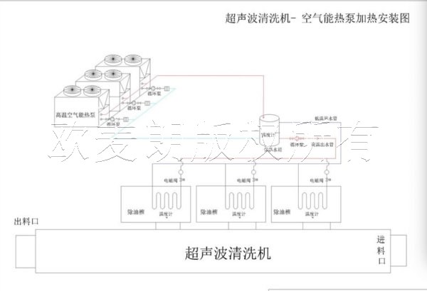 而高溫空氣能熱泵加熱,是通過空氣能熱泵主機(jī)制熱高溫?zé)崴?,?jīng)過水泵流入清洗槽換熱盤管,加熱槽液,使得槽液溫度恒溫在50℃-70℃。每個(gè)槽體溫度控制,采用電磁閥控制,當(dāng)清洗槽溫度沒有達(dá)到要求,電磁閥打開,高溫水進(jìn)入盤管,加熱槽液。當(dāng)清洗槽溫度到了后,電磁閥關(guān)閉,切斷高溫水,滿足各清洗槽恒溫要求。