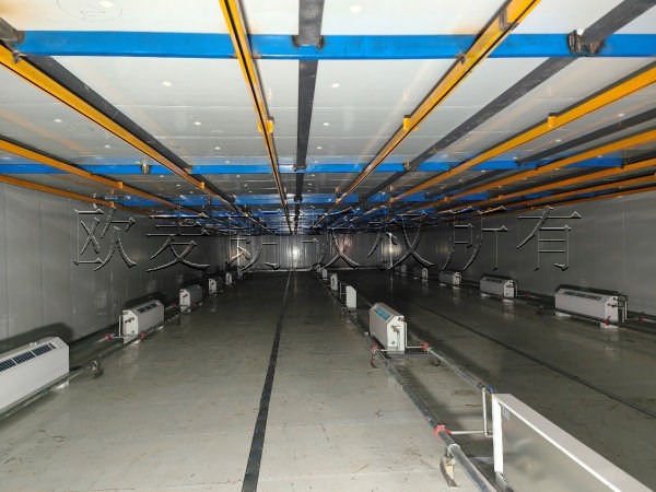此次我們?yōu)榭蛻艏揖咚云岷娓墒褂枚ㄖ圃O(shè)計(jì)的烘干熱泵機(jī)組來實(shí)現(xiàn)的。我們根據(jù)生產(chǎn)線作業(yè)需要,配置了3臺(tái)歐麥朗熱泵烘干機(jī),一個(gè)500平的烘房,在烘房頂部配置了自動(dòng)懸掛線。烘房?jī)?nèi)部均勻擺放多臺(tái)風(fēng)機(jī)盤管,用于高溫?zé)犸L(fēng)的輸送。當(dāng)水性漆噴涂完畢后,家具由懸掛線進(jìn)入烘房?jī)?nèi),再由高溫?zé)犸L(fēng)烘干后在輸送出烘房。