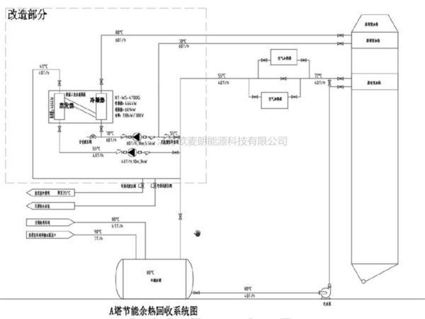 調(diào)質(zhì)塔 A 采用冷凝水的熱量進行加熱,現(xiàn)在形式為冷凝水進行水箱后,又水箱內(nèi)的水循環(huán)至末端進行換熱,多余的水進行外排,目前排水溫度為 80℃,擬對換熱后的水進行二次熱回收,回收后的余熱進行二次利用,降低外排溫度。