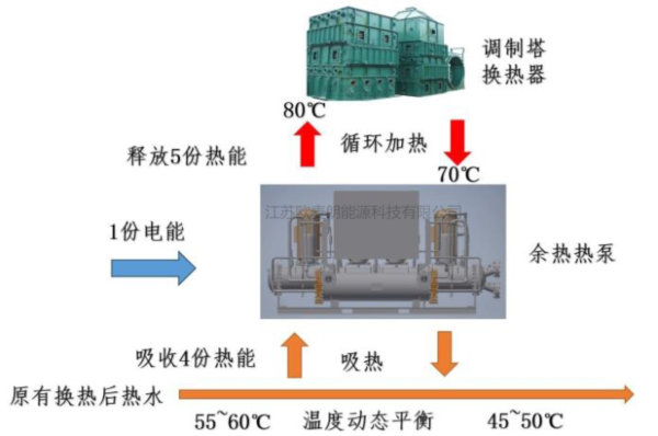 本項目采用采用電力作為驅(qū)動動力,針對調(diào)制塔換熱后的熱水進行二次熱回收,系統(tǒng)原理下: