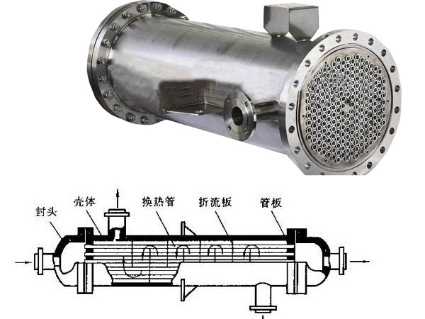 管殼式換熱器由殼體、傳熱管束、管板、折流板(擋板)和管箱等部件組成。殼體多為圓柱形,內(nèi)有管束,管束兩端固定在管板上。傳熱有兩種熱流體和冷流體,一種是管內(nèi)流體,稱為管側(cè)流體;另一種是管外流體,稱為殼側(cè)流體。