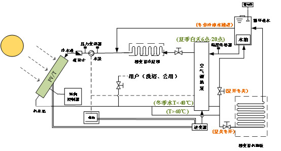 冬季工況時(shí),太陽(yáng)輻射太陽(yáng)能PV/T板進(jìn)行電量存儲(chǔ),通過壓力變送器驅(qū)動(dòng)水泵從水箱抽水對(duì)其進(jìn)行冷卻。從太陽(yáng)能PV/T板冷卻通道出來的熱水一部分供給用戶用于洗浴、公共設(shè)施用水外,另一部分用于相變地板儲(chǔ)熱。當(dāng)水溫高于40℃時(shí),熱水直接進(jìn)入相變地板儲(chǔ)熱,當(dāng)水溫低于40℃時(shí),開啟空氣源熱泵對(duì)其進(jìn)行加熱后對(duì)地板進(jìn)行熱量存儲(chǔ),經(jīng)過地板的出水直接進(jìn)入水箱循環(huán)使用。
