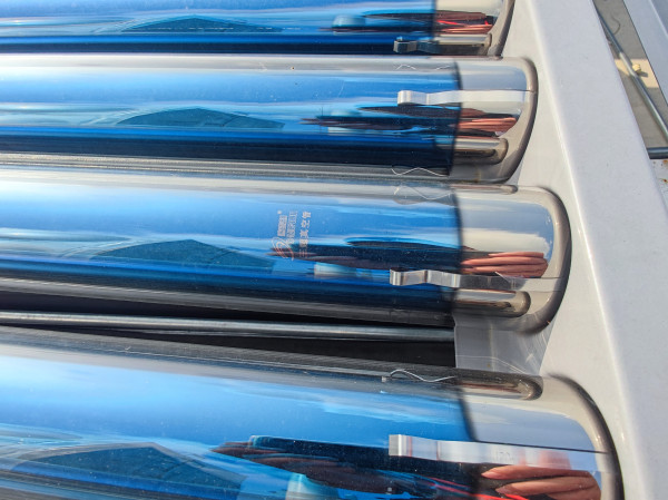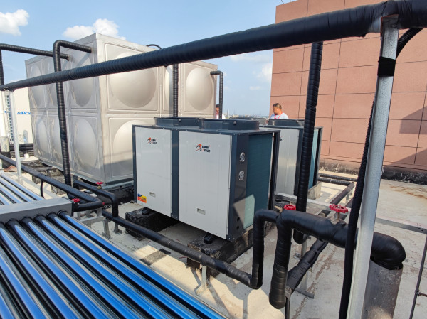 熱水系統(tǒng)配置:27組太陽能集熱器、兩臺十匹空氣能、一個方形水箱