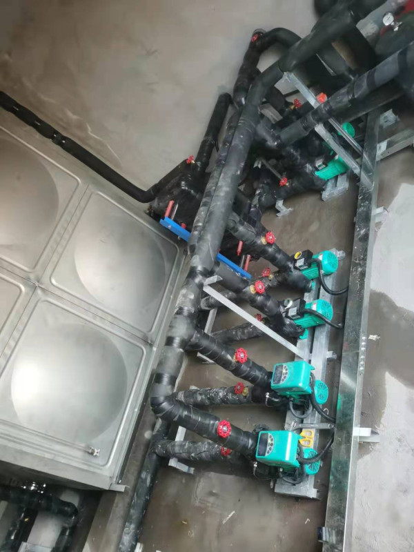 項目配置:采用80塊平板太陽能集熱器+兩臺7P低溫空氣能熱泵+一個8噸方形保溫水箱