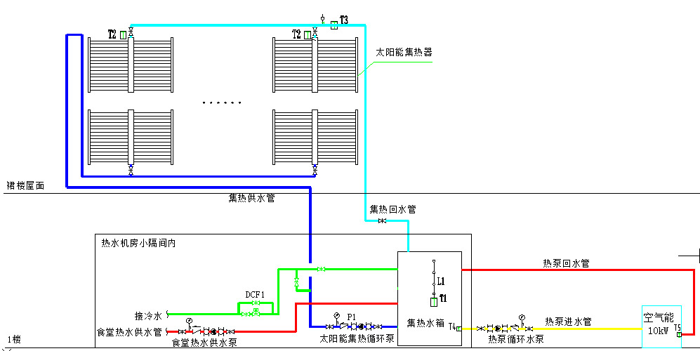 工程概況:南京某公司食堂及生活熱水原來采用的是蒸汽換熱產(chǎn)生的,鑒于蒸汽使用時,熱力公司會根據(jù)低蒸汽流量來收取費用,夏季蒸汽主要用來生產(chǎn)生活熱水,雖然耗熱量不大,但每個月熱力公司收取的費用很高?,F(xiàn)在考慮7-9月份將蒸汽關(guān)閉,采用更經(jīng)濟節(jié)能的太陽能+空氣源熱泵的加熱方式,來滿足生活熱水需求。
