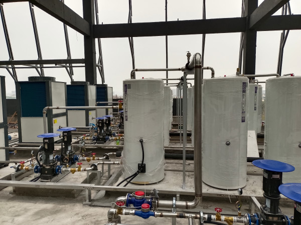 其中A座采用1臺空氣能熱泵主機+500L承壓水箱,B座采用8臺空氣能熱泵主機+8個455L承壓水箱+24個455L承壓水箱(兩套),C座采用3臺空氣能熱泵主機+1個455L承壓水箱+4個455L承壓水箱。