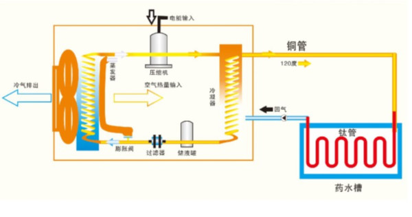 第一種直接加熱:利用空氣能加熱的電鍍槽系統(tǒng),如下圖所示: