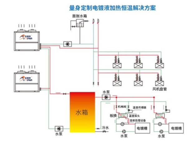 通過熱泵主機(jī)加熱儲(chǔ)熱水箱的熱水,再把熱水通過板換與槽液進(jìn)行換熱,由溫度傳感器控制水管恒溫閥的開關(guān)。