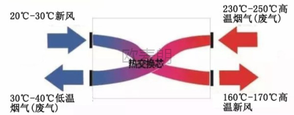 230度左右的高溫煙氣由進氣口進入換熱裝置,新風由另一端的進口進入換熱器。換熱器內(nèi)部均勻分布有是多個高效的換熱裝置,通過串聯(lián)和并聯(lián)的方式組合在一起。新風和廢氣在里面一層一層的換熱,換熱到末端時,新風出風口會達到160度左右,廢氣出風口溫度在30度左右。