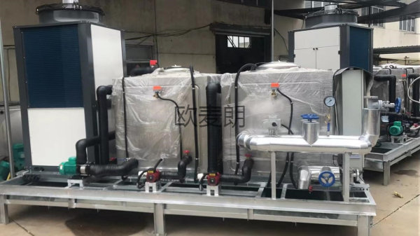 1、1臺歐麥朗空氣源熱泵熱水機(jī)組+1噸保溫水箱,將水溫?zé)?0-45度,給高溫水源熱泵提供熱源,名義制熱量為65KW,功率為21.6KW。