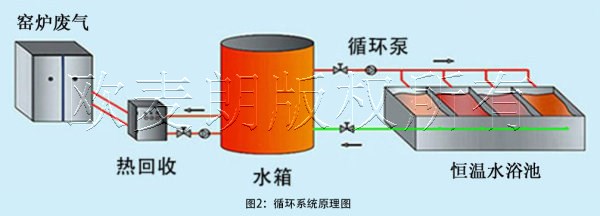 一是將廢氣換熱產(chǎn)生的高溫?zé)崴徊糠州斔偷狡渌a(chǎn)線(xiàn)上用于生產(chǎn),只留一部分用于恒溫池加熱,這個(gè)方案需要制備一個(gè)蓄熱水箱,用來(lái)儲(chǔ)備換熱器制取的熱水,熱水箱做兩路循環(huán)一路做為水池恒溫用,另一路作為生產(chǎn)車(chē)間使用。