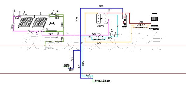 下圖為無動力太陽能系統(tǒng)+承壓熱泵原理圖
