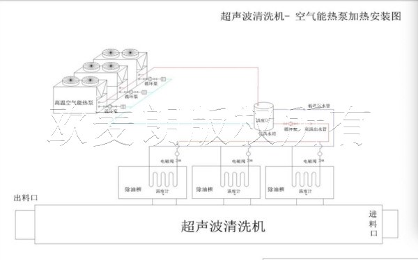 制熱冷回收熱泵加熱,是通過空氣能或余熱水源制熱高溫?zé)崴?jīng)過水泵流入清洗槽換熱盤管,加熱槽液,使的槽液溫度恒溫在50℃-70℃。每個槽體溫度控制,采用電磁閥控制,當(dāng)清洗槽溫度沒有達(dá)到要求,電磁閥打開,高溫水進(jìn)入盤管,加熱槽液。當(dāng)清洗槽溫度到了后,電磁閥關(guān)閉,切斷高溫水,滿足各清洗槽恒溫要求。