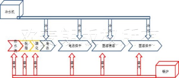 涂裝車間一般工藝流程為前處理、電泳、電泳烘干、面漆噴漆、面漆烘干等工序,工序中有加熱和冷卻等需求,至今常規(guī)加熱、冷卻能源幾乎都是燃?xì)庵苯蛹訜嵴羝ǜ邏簾崴厮┖屠鋬鰴C(jī)冷水。各需求之間獨(dú)立處理,沒有做能源回收再利用的整合處理,造成能源浪費(fèi),單產(chǎn)能耗高等問題。