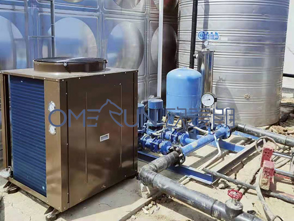設(shè)備配置:兩臺15p空氣源熱泵+2個10噸不銹鋼保溫水箱(滿足現(xiàn)場施工人員洗浴用水);一臺5p空氣源熱泵+1個5噸不銹鋼保溫水箱(滿足施工現(xiàn)場管理人員洗浴用水);軟化水處理設(shè)備+變頻供水泵共用。
